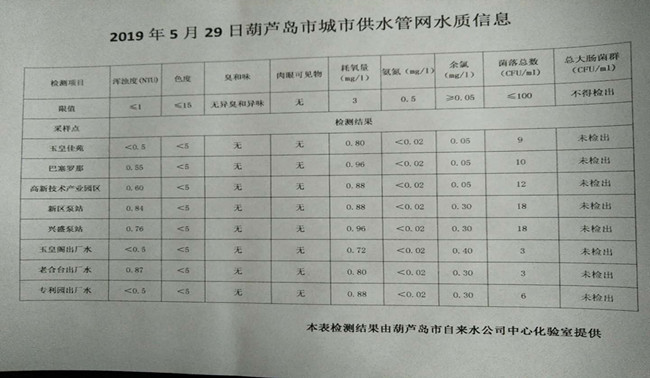 2019年5月29日葫蘆島市城市供水管網(wǎng)水質(zhì)信息