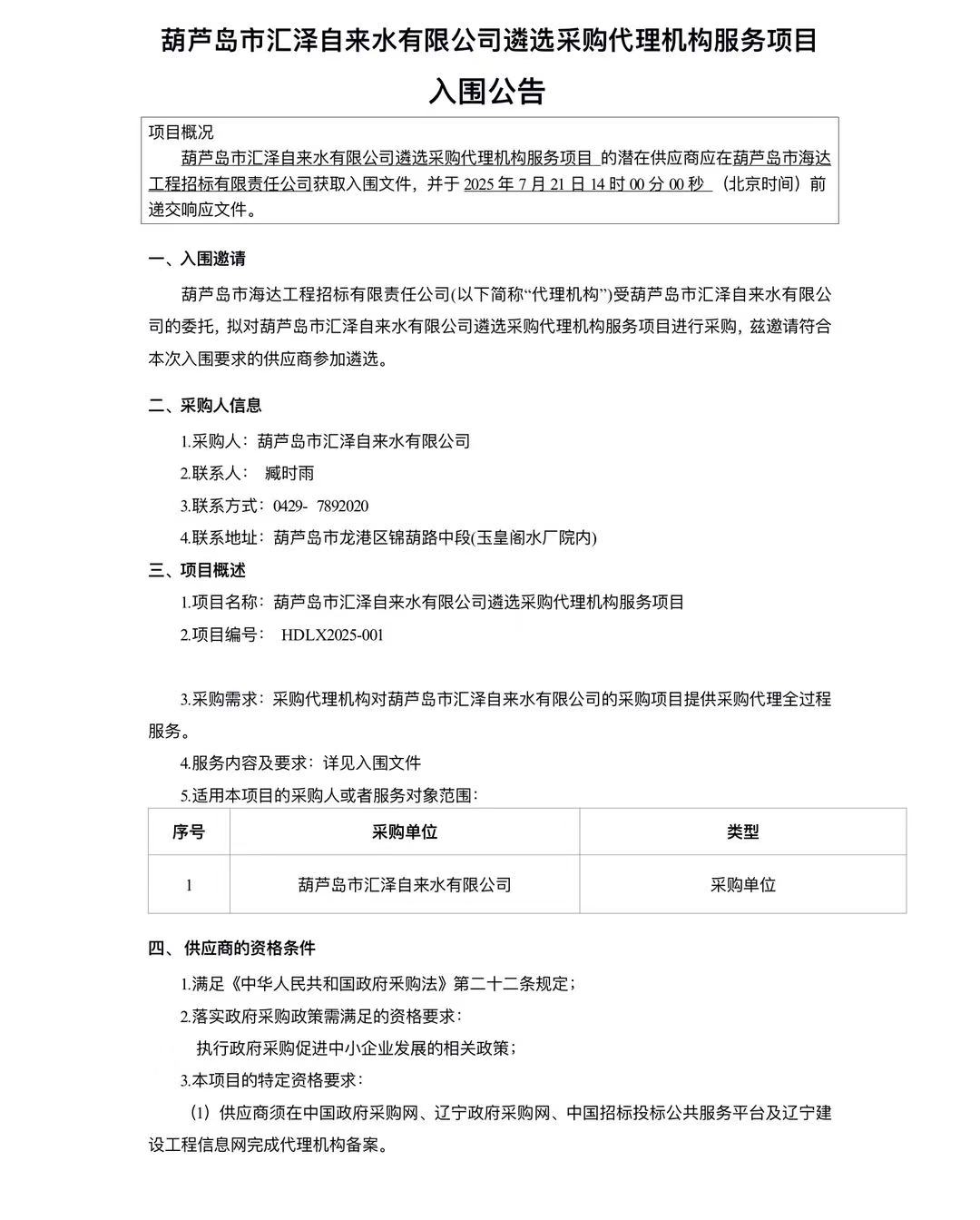 葫蘆島市匯澤自來(lái)水有限公司遴選采購(gòu)代理機(jī)構(gòu)服務(wù)項(xiàng)目 入圍公告