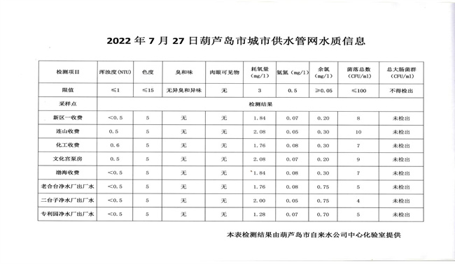 2022年7月27日葫蘆島市城市供水管網(wǎng)水質(zhì)信息