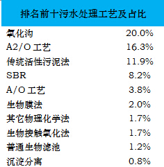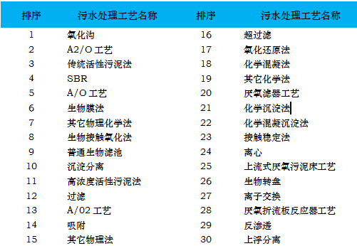 據(jù)不完全統(tǒng)計,全國范圍內(nèi)已建成運營的污水處理廠數(shù)量約4000座,這其中有統(tǒng)計數(shù)據(jù)的污水處理工藝大約30種左右,E20研究院統(tǒng)計各類技術工藝,排名如下文所示: