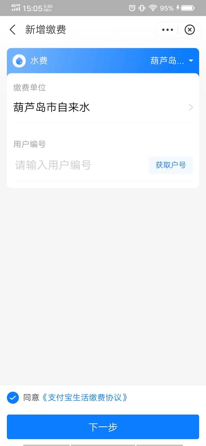 點擊繳費單位(葫蘆島市自來水公司)—輸入用戶編號—點擊下方同意—填寫家庭住址