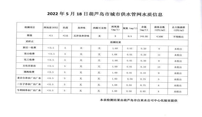 2022年5月18日葫蘆島市城市供水管網(wǎng)水質(zhì)信息
