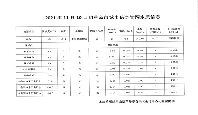 2021年11月10日葫蘆島市城市供水管網水質信息
