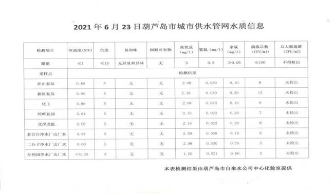 2021年6月23日葫蘆島市城市供水管網(wǎng)水質信息