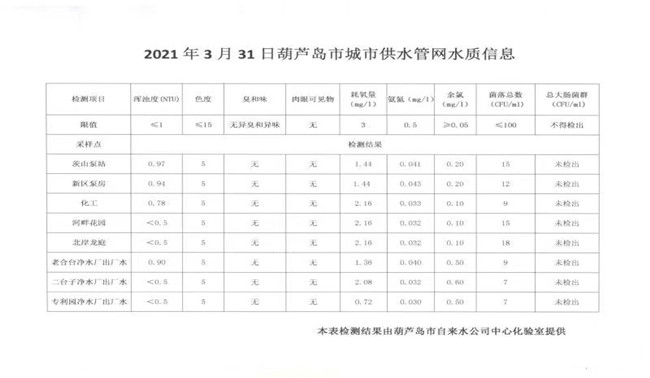 2021年3月31日葫蘆島市城市供水管網(wǎng)水質(zhì)信息
