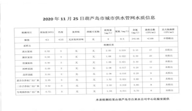 2020年11月25日葫蘆島市城市供水管網(wǎng)水質信息