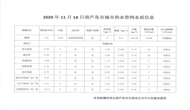 2020年11月18日葫蘆島市城市供水管網水質信息