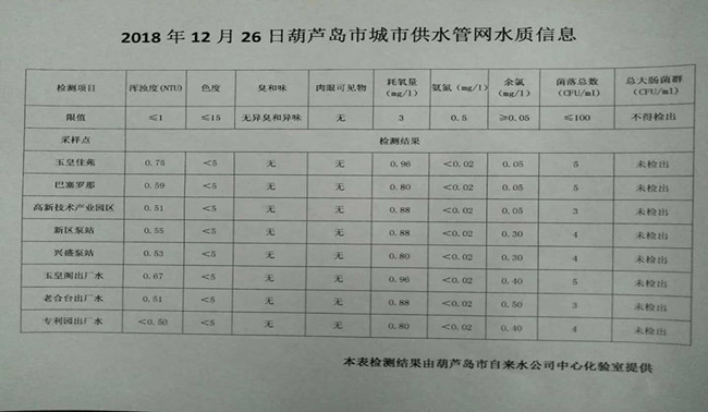 2018年12月26日葫蘆島市城市供水管網(wǎng)水質信息