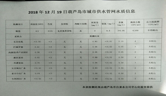 2018年12月19日葫蘆島市城市供水管網(wǎng)水質(zhì)信息