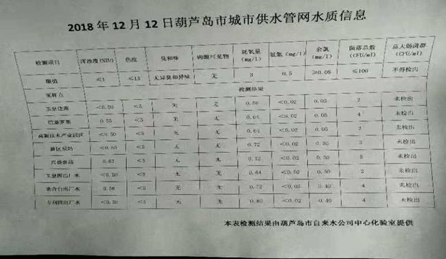 2018年12月12日葫蘆島市城市供水管網(wǎng)水質信息