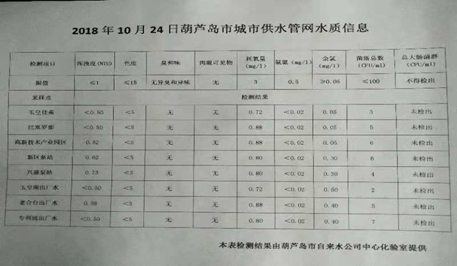 2018年10月24日葫蘆島市城市供水管網(wǎng)水質(zhì)信息