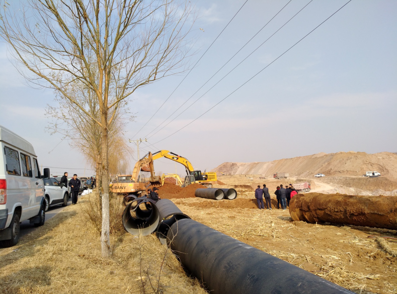 當天下午4時,市自來水工程總公司抽調(diào)的35名搶修精干力量投入搶修作業(yè),同時出動大型挖掘機3臺,搶修設(shè)備包括大小發(fā)電機組7臺,水泵3臺,電焊機6臺。搶修難度遠比預(yù)想的要困難得多。地下管線十分復(fù)雜,破損點位排查困難,實施停水作業(yè)后,最終確定破損位置,因次生土壤塌方將200余延長米管線壓斷,并且破口較大,經(jīng)現(xiàn)場有關(guān)技術(shù)人員一致研究決定采取徹底換管的方案。由于受損管線長達200余米,并且管徑大,原材料庫存少,公司材料處當場聯(lián)系,緊急調(diào)動新管線。搶修過程中,需要穿越鋅廠位于地下2.2米深的DN800供水管線,使新的輸水管線需要深挖至6米深的地下實施安裝。并且安裝的管邊離1萬伏的電纜不到1米遠,十分危險,為保障安全,施工中先用吊車、挖掘機扶住電線桿子后再作業(yè)。初冬的11月份,深夜氣溫驟降。搶修人員冒著零下十幾度的嚴寒,輪流吃飯,舍不得片刻休息,搶時間、爭速度。